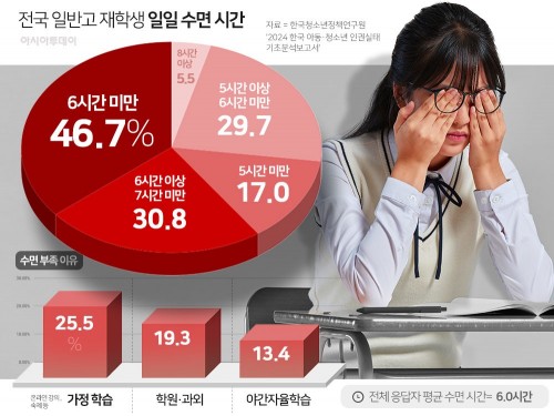 Theo “Báo cáo phân tích cơ bản về thực trạng nhân quyền trẻ em và thanh thiếu niên Hàn Quốc 2024” do Viện Chính sách Thanh thiếu niên Hàn Quốc công bố ngày 7, khảo sát 2.258 học sinh đang theo học tại các trường trung học phổ thông thường trên toàn quốc cho thấy 46,7% học sinh cho biết thời gian ngủ hàng ngày dưới 6 giờ.