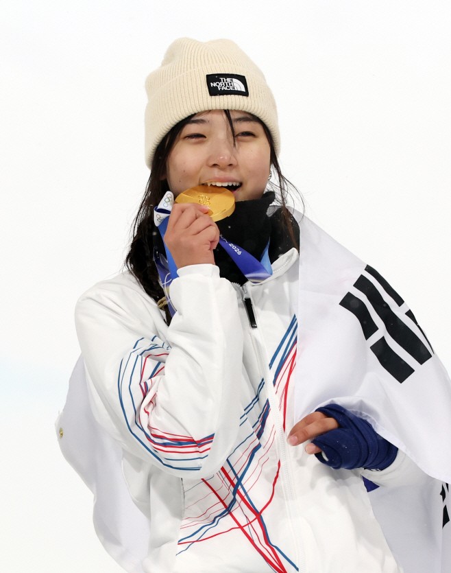 Ngày 12 (giờ địa phương), tại Snowpark Livigno, Ý, ở chung kết nội dung halfpipe nữ môn trượt ván tuyết thuộc Thế vận hội Mùa đông Milano–Cortina d’Ampezzo 2026, vận động viên Hàn Quốc Choi Ga-on giành chiến thắng với 90,25 điểm và cắn tấm huy chương vàng trên môi. / Yonhap News |
